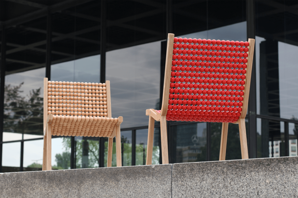 Painted by „Ruprecht Dreher“ Limited Edition Each piece is handmade and numbered and signed on the bottom. MaterialWooden cheeks – Birch plywood; Wooden spheres – Beech wood; Round tubes – Carbon fiber tubes and stainless steel tubes; Surface – Shellac polish. Dimensions75 x 52 x 62 cm / 7,5 KG Seat height39 cm