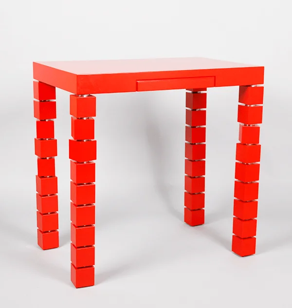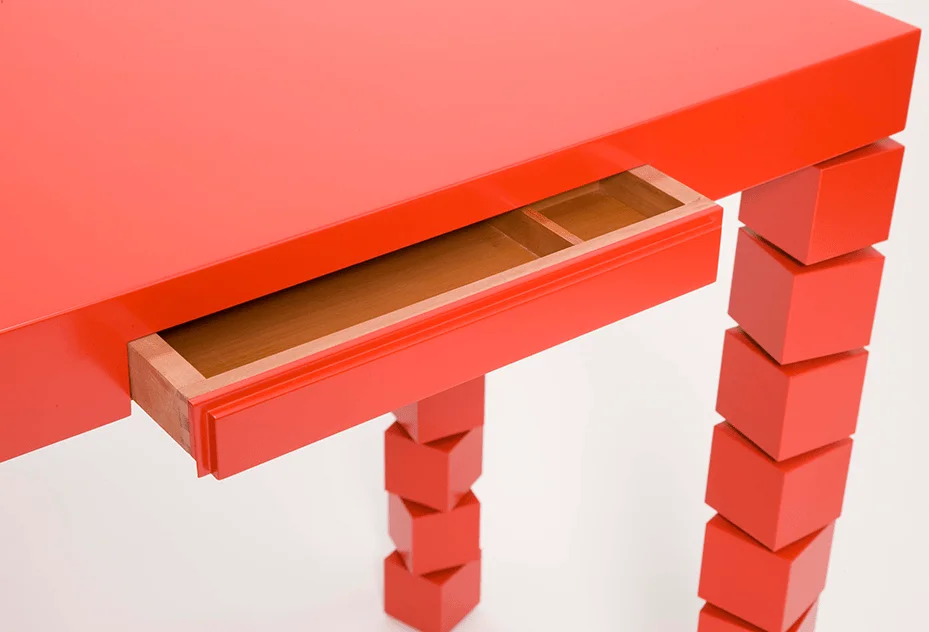 The table top rests on the frame with a 45 degree cut. Four round tubes pierce the 40 cubes. Washers turned from stainless steel. Drawer.